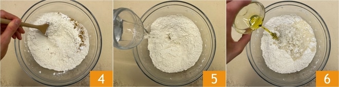 Mezclad bien 4, luego añadid el agua 5 y el aceite 6.