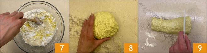 Integrad la mezcla con una cuchara 7, luego continuad trabajando en la mesa hasta obtener una masa homogénea 8; si resulta difícil de manejar, podéis engrasar ligeramente los dedos y la superficie de trabajo. Formad un cilindro y divididlo en 10 trozos de unos 55 g cada uno 9.