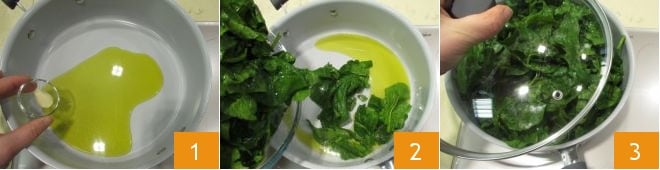 Para preparar la bolsa de ternera rellena, empieza por el relleno: lava las espinacas bajo el agua corriente, luego en una cazuela calienta el aceite de oliva, añade el diente de ajo pelado 1 y las espinacas aún húmedas 2, cubre con la tapa 3 y deja que se ablanden durante 3-4 minutos a fuego medio.