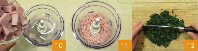 viértelo en la batidora 10 para desmenuzarlo bien 11. Retoma las espinacas ya frías y pícalas con un cuchillo 12.