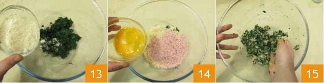 En un bol grande, vierte las espinacas, el queso rallado 13, la miga de pan rallada, el jamón cocido picado y el huevo 14. Amasa con las manos 15 para obtener una mezcla homogénea.