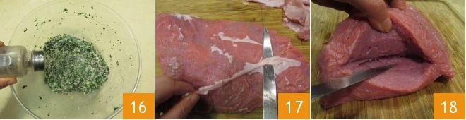 Salpimienta 16 y reserva el relleno. Ahora toma la carne, corta la grasa 17, haz un corte central para obtener una bolsa 18.