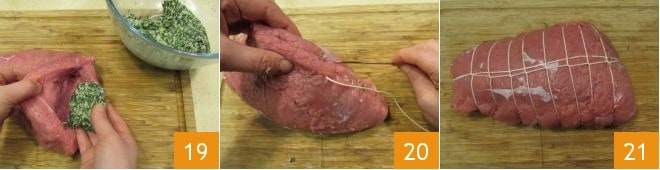 Rellena la bolsa con el relleno 19, cose el corte con hilo de cocina 20 para cerrar bien la bolsa y que no se salga el relleno. En este punto, ata la carne como se hace habitualmente para los asados 21, para realizar mejor este procedimiento puedes leer nuestra guía cómo atar el asado.