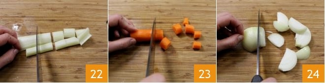 Procede con la cocción de la bolsa de ternera rellena: lava y pela el apio, la zanahoria y la cebolla, luego corta las verduras en trozos (22-23-24).