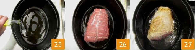 Calienta el aceite en la cazuela 25, coloca la bolsa de ternera 26 y deja que se dore por ambos lados durante unos minutos, hasta que la superficie esté bien dorada 27.