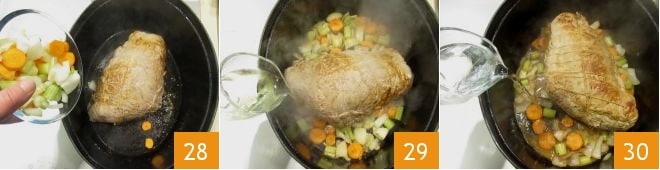 Ahora añade las verduras en trozos 28, desglasa con el vino blanco 29, cubre con agua caliente 30,