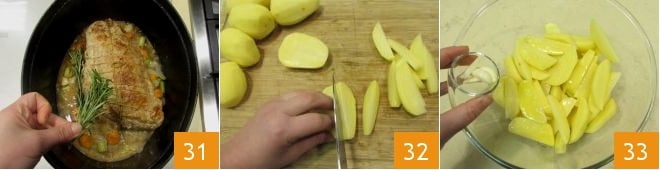 aromatiza con el romero 31, cubre con la tapa y cocina a fuego lento durante 75 minutos girando la ternera de vez en cuando y cubriéndola con el fondo de cocción. Mientras tanto, prepara las patatas: lávalas, pélalas y córtalas en grandes gajos 32,