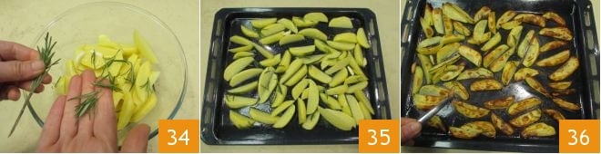 viértelas en un bol, condimenta con aceite, sal, ajo y romero 34, luego viértelas en una bandeja de horno 35 y cocina en horno ventilado a 220° durante 50 minutos o hasta que estén bien asadas 36.