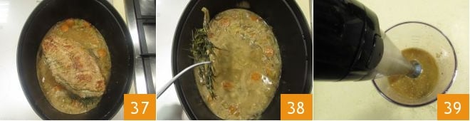 Mientras tanto, la ternera también habrá terminado de cocinarse 37, elimina la ramita de romero 38, vierte el fondo de cocción en el vaso de la batidora y tritúralo para obtener una salsa lisa 39.