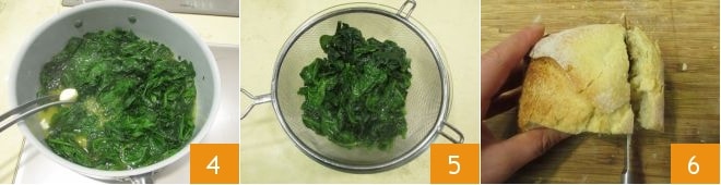 Una vez que las espinacas estén suaves, apaga el fuego, elimina el diente de ajo 4 y colócalas a escurrir en un colador para eliminar el exceso de agua 5. Deja enfriar las espinacas y toma la hogaza, elimina la corteza 6.