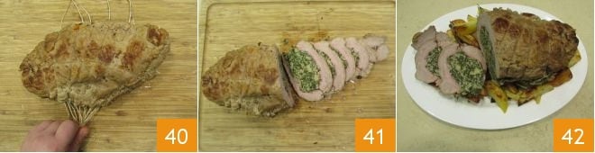 Toma la bolsa de ternera rellena, elimina el hilo 40, córtala en rodajas 41 y sirve la carne bien caliente acompañada de las patatas 42 y el fondo de cocción.