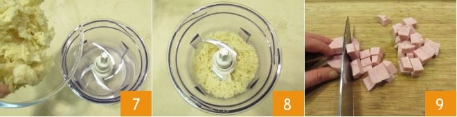 y vierte la miga en la batidora 7, tritura para obtener un compuesto desmenuzado 8. Corta en trozos también el jamón cocido 9,