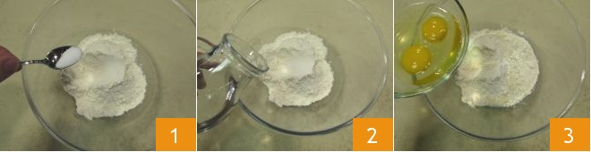 Para realizar las bolsitas de manzana y chocolate, primero prepara la masa: tamiza la harina y la levadura en un bol, añade la sal 1, el agua 2, los huevos 3