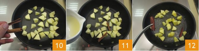 Ahora vierte los cubos de manzana en una sartén, añade las ramas de canela 10 y el jugo de limón 11 y saltea a fuego alto durante 5 minutos, luego elimina la canela 12.