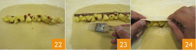 En este punto puedes insertar el relleno: añade la mezcla de manzana y avellanas a unos cm de distancia del borde superior del rectángulo obtenido 22, añade los palitos de chocolate y pincela la parte inferior con agua 23; dobla el borde superior hacia ti para cubrir el relleno 24 y presiona suavemente con los dedos para sellar la masa.