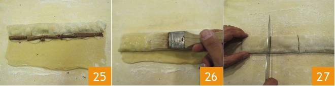 Añade otra fila de palitos de chocolate 25, pincela la parte inferior y continúa doblando la masa hasta llegar al otro extremo del rectángulo. Finalmente, pincela la superficie del rollo obtenido con un poco de agua 26 y séllalo presionando suavemente. Manteniendo el cierre hacia abajo, divide cada rollo en 4 partes 27