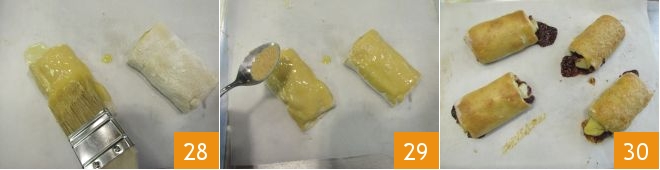 que transferirás a una bandeja forrada con papel de horno. Repite el mismo procedimiento con la segunda porción de masa para formar otras 4 bolsitas. Finalmente, pincela las bolsitas obtenidas con el huevo batido 28 y espolvoréalas con azúcar moreno 29, luego hornea en el horno estático precalentado a 180° durante unos 25 minutos hasta que estén bien doradas 30. ¡Sirve tus deliciosas bolsitas de manzana y chocolate aún tibias 30!