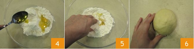 y el aceite 4. Amasa con los dedos para mezclar todos los ingredientes 5, luego transfiere la mezcla sobre la superficie de trabajo y continúa trabajándola hasta formar una bola lisa y uniforme 6. Envuelve la masa en film transparente y déjala reposar en un lugar fresco durante 30 minutos.