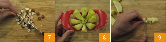 Mientras tanto, prepara el relleno: tritura las avellanas en trozos grandes 7, luego lava la manzana y córtala en gajos, eliminando el corazón 8. Finalmente, pela los gajos de manzana y córtalos en cubos 9.