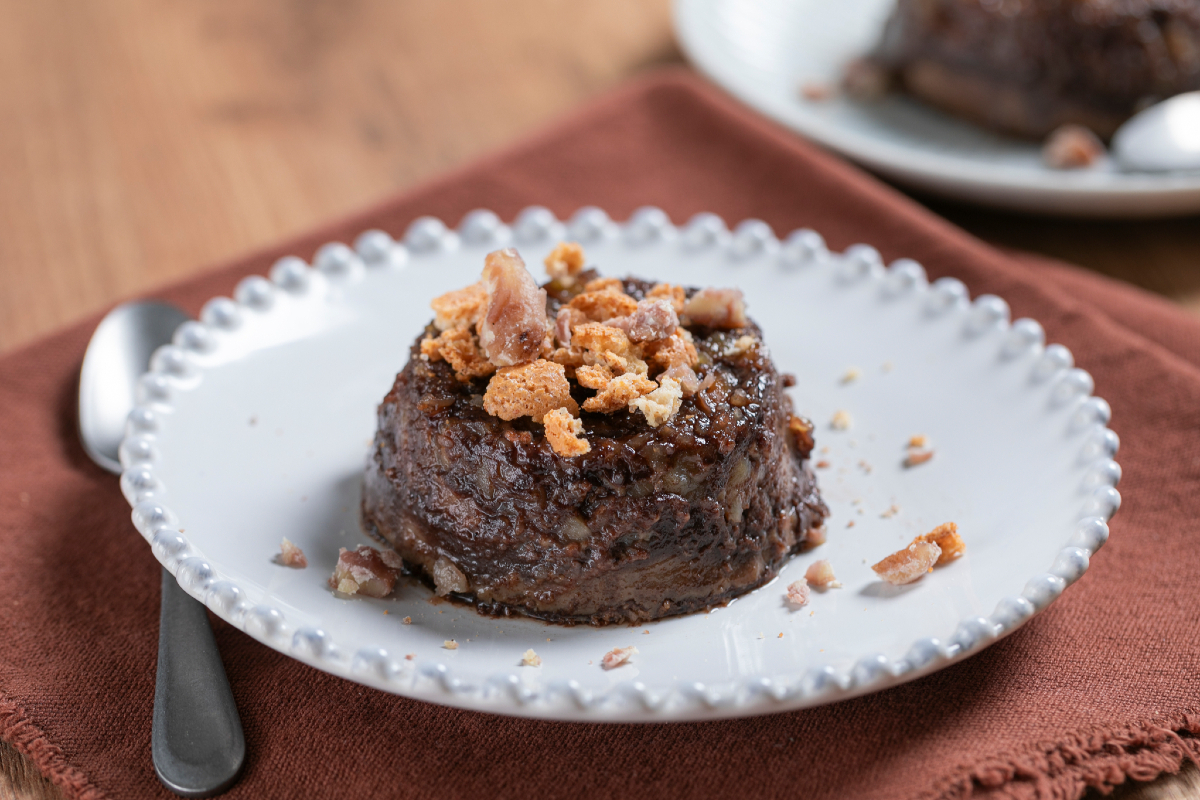 El resultado es un postre de cuchara suave y aterciopelado, perfectamente caramelizado en la superficie, que conserva el alma del bonet original pero lo enriquece con un toque rústico y típicamente otoñal.
