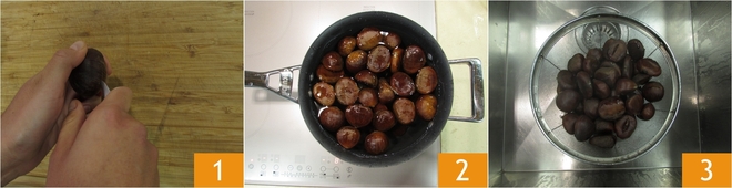 Para preparar el bonet de castañas, lo primero que hay que hacer es marcar todas las castañas previstas en la receta, ponerlas en un cazo con agua fría y cocerlas durante unos 20 minutos desde que rompa a hervir. Cuando estén tiernas, escurrirlas.