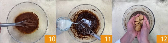 Mezclad nuevamente con el batidor 10, luego verted la leche lentamente 11. Desmenuzad los amaretti con las manos y agregadlos directamente a la mezcla 12.