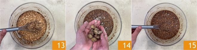 Mezclad nuevamente con el batidor 13, luego añadid 200 g de castañas cocidas, peladas y desmenuzadas a mano 14. Mezclad una última vez 15.
