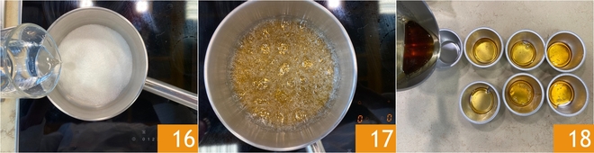 Ahora preparad el caramelo: en un cazo, verted el azúcar y el agua 16, luego calentad a fuego medio-bajo sin mezclar hasta que la mezcla adquiera un color ámbar 17. Cuando el caramelo esté listo, distribuidlo uniformemente dentro de 10 moldes de aluminio desechables con capacidad de 110 g 18.