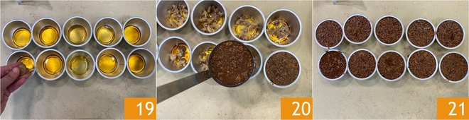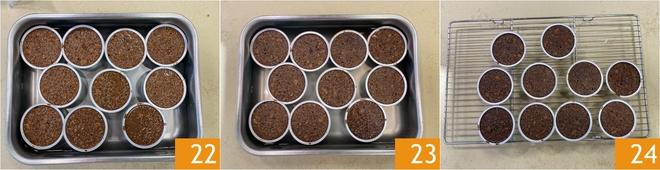 Transferid los moldes a una fuente y coced a baño maría: añadid agua hirviendo dentro de la fuente de manera que alcance la mitad de la altura de los moldes 22 y coced en horno estático precalentado a 150° durante unos 60 minutos. Pasado este tiempo, abrid el horno y verificad la cocción. Si al mover el molde la mezcla aún está un poco líquida, prolongad la cocción 10 minutos más. En este punto, sacad del horno 23 y retirad con cuidado los moldes de la fuente. Dejad que se enfríen completamente a temperatura ambiente 24, luego transferidlos al frigorífico durante al menos 6 horas.
