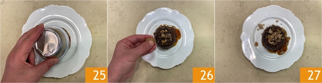 Una vez fríos, para desmoldar el bonet más fácilmente, calentad rápidamente solo la base con un soplete, o sumergid la base del molde en agua caliente durante unos segundos. Volcadlo delicadamente en un plato de servir 25. Decorad desmenuzando los amaretti y las castañas restantes 26 y servid inmediatamente vuestro bonet de castañas 27!