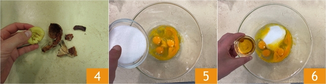 Dejadlas templar, luego peladlas 4 y reservadlas. En un bol, verted los huevos y la yema, luego añadid el azúcar 5 y el licor de amaretto 6.