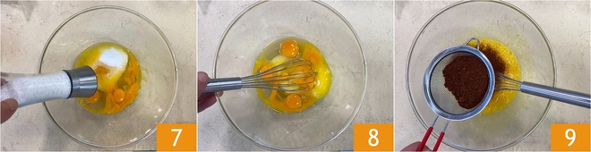 Agregad también una pizca de sal 7 y mezclad bien con un batidor de mano 8. Tamizad el cacao en el interior 9.