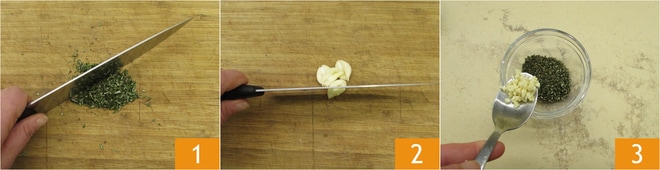 Para preparar los boniatos al horno, primero pica finamente el romero 1 y el ajo 2. Viértelos en un cuenco pequeño 3.