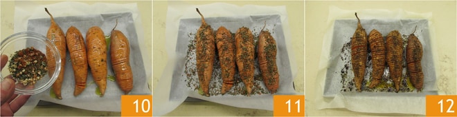 y finalmente distribuye bien la mezcla de aromas sobre los boniatos 10 11. Hornea en modo ventilado durante 50-55 minutos. Transcurrido el tiempo de cocción, sirve tus boniatos al horno 12.