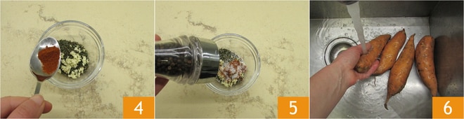 y sazona con pimentón dulce 4, sal y pimienta 5. Mezcla para combinar los aromas. Comienza a precalentar el horno a 200° en modo ventilado. Lava bien los boniatos bajo el agua corriente eliminando cualquier residuo de tierra 6.