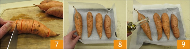 Corta los boniatos en rodajas de un grosor de 3-4 mm, sin cortarlos hasta el fondo 7. Para facilitarte, puedes insertar una brocheta larga en la base del boniato a 1 cm. Colócalos en una bandeja cubierta con papel de horno 8. Ahora sazona los boniatos con el aceite 9.