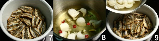 Coloca los boquerones en un recipiente 7. Pon en una cacerola el vinagre, el vino blanco, la sal, la cebolleta cortada en gajos, la guindilla cortada en rodajas y el ajo cortado por la mitad (o en rodajas) 8. Lleva lentamente a ebullición, cocina durante 2-3 minutos y luego apaga el fuego; vierte la mezcla caliente de vinagre sobre los boquerones hasta cubrirlos 9, luego déjalos marinar durante al menos 12 horas en un lugar fresco.