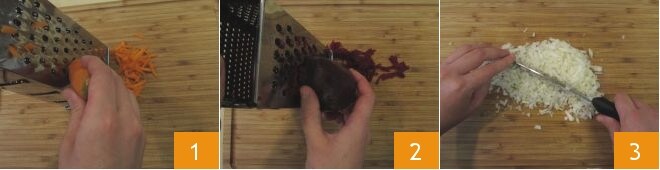 Para preparar el borsch de seitán, preparad el caldo de verduras. Luego pelad y rallad con un rallador de agujeros grandes la zanahoria 1 y la remolacha 2. Luego limpiad y picad la cebolla 3.