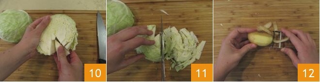 Mientras tanto, encargaos de la col, después de quitar las hojas externas, dividid el repollo en dos y cortad la parte central eliminándola 10. Luego cortadla en rodajas 11 y pasad a la patata. Después de lavarla y secarla, peladla 12