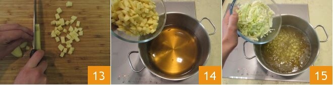 Y cortadla en cubos de aproximadamente 1 cm 13. Trasladaros a los fogones. En una olla donde habréis calentado el caldo de verduras, sumergid las patatas 14 dejándolas cocer durante 15 minutos. Transcurrido el tiempo, añadid el repollo y continuad la cocción por otros 5 minutos 15.