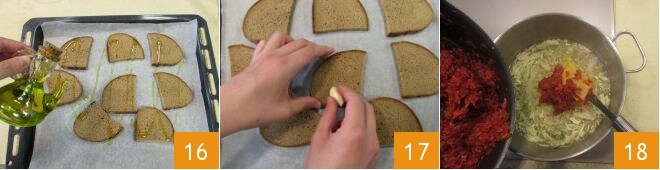 Mientras tanto, encargaos del pan: después de cortarlo en rodajas, disponed las rebanadas en una bandeja de horno con papel de hornear y rociadlas con un hilo de aceite 16. Luego tostad las rebanadas en el horno estático ya caliente a 200° durante unos 8 minutos. Tan pronto como estén listas, sacadlas del horno y, todavía calientes, frotadlas con un diente de ajo pelado 17. La zanahoria y la remolacha con el tomate en este punto estarán listos, así que únidlos en la sartén con las patatas y el repollo 18.