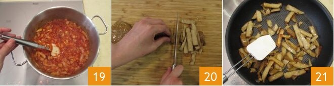 Mezclad y dejad que se impregne durante unos diez minutos más 19. Tenéis justo el tiempo de cortar el seitán en tiras 20. Luego poned al fuego una sartén, dentro un chorrito de aceite y calentad. Después añadid el seitán y doradlo a fuego vivo durante 5 minutos, removiendo a menudo; ajustad de sal y pimienta 21.