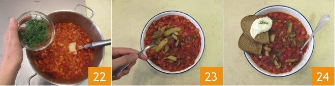 A fuego apagado, perfumad la sopa con el eneldo 22. Mezclad y emplatar, añadid en cada plato el seitán 23 y luego adornad vuestro borsch de seitán con dos rebanadas de pan y una cucharada de nata agria 24.