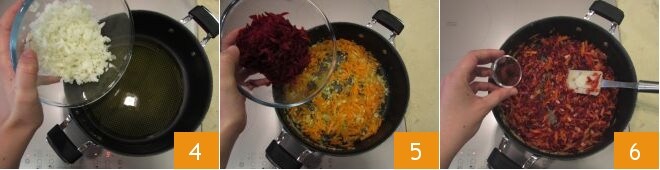 Trasladaros a los fogones y verted en una cacerola, encended el fuego y calentad el aceite junto con las cebollas 4, removiendo de vez en cuando. Después de dorar a fuego medio, añadid la zanahoria y la remolacha picadas 5. Después de otro minuto, agregad el concentrado de tomate 6