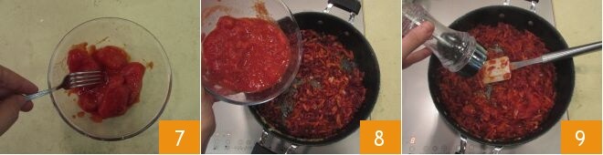 Mientras tanto, machacad los tomates pelados con un tenedor 7 y luego únidlos en la olla 8. Ajustad de sal y pimienta, mezclad y dejad cocinar a fuego lento durante unos 25 minutos 9.