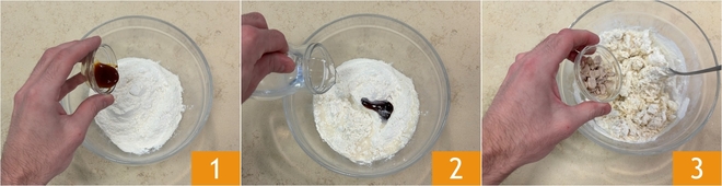 Comenzad por la preparación de la focaccia genovesa: en un bol verted la harina, la malta 1 y la mitad de la cantidad de agua 2. Comenzad a amasar con el tenedor; una vez absorbido el líquido, añadid un poco más de agua y la levadura desmenuzada 3.