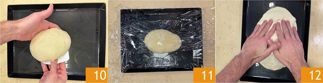 Transcurrido el tiempo de reposo, aceitad una bandeja de horno y colocad aquí la bola 10, luego aceitad también la superficie de la masa. Cubrid con film 11 y dejad levar durante 50 minutos a temperatura ambiente. Pasado este tiempo, estirad la masa con las manos dentro de la bandeja 12.