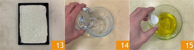 Deberéis cubrir toda la superficie; si la masa resulta demasiado elástica, cubridla nuevamente con film y dejadla reposar otros 15 minutos. Una vez estirada, la focaccia deberá levar durante 2 horas en el horno apagado con la luz encendida. Mientras tanto, preparad la salmuera: en un bol verted el agua 14, el aceite y la sal 15.