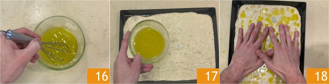 Emulsionad con la batidora. Transcurridas las 2 horas de levado, distribuid sobre la focaccia la mayor parte de la salmuera 17, teniendo cuidado de reservar algunas cucharadas para extender después de la cocción. Presionad la masa con las yemas de los dedos para formar los característicos agujeros 18.