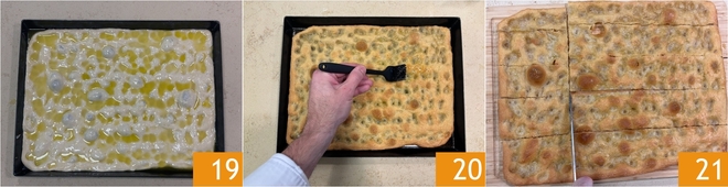 Dejad levar durante otros 15 minutos a temperatura ambiente 19. Coced en horno estático precalentado a 240° durante 18-20 minutos. Una vez cocida, sacad del horno y pintad la superficie con la salmuera reservada 20. Finalmente, cortad la focaccia genovesa en tiras y reservadla 21.